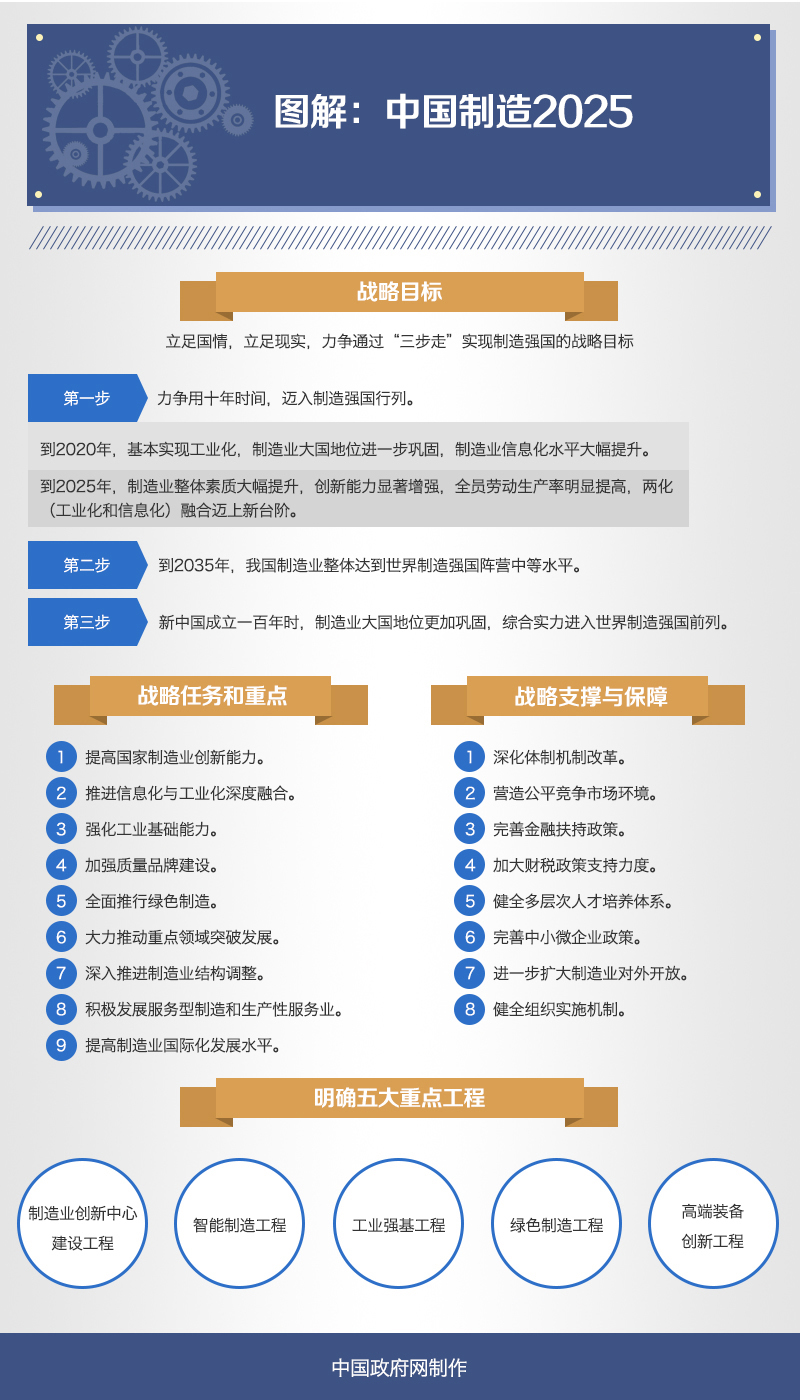 《中国制造2025》提出,坚持“创新驱动、质量为先、绿色发展、结构优化、人才为本”的基本方针,坚持“市场主导、政府引导,立足当前、着眼长远,整体推进、重点突破,自主发展、开放合作”的基本原则,通过“三步走”实现制造强国的战略目标:第一步,到2025年迈入制造强国行列;第二步,到2035年中国制造业整体达到世界制造强国阵营中等水平;第三步,到新中国成立一百年时,综合实力进入世界制造强国前列。