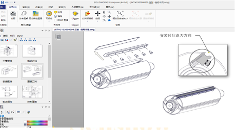 在市场销售环节中,由于改变了过去传统的纸板、静态的产品表现形式,结合SOLIDWORKS Composer产品,实现了产品动态的还原,以此帮助客户、生产能够更为直观的了解到产品的结构。同时,该功能在技术维护部门中也得到了大量的应用,将产品通过Composer系统进行转换,实现动态说明书的编制。