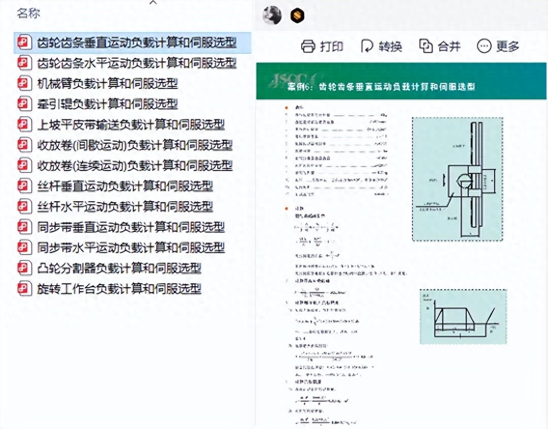 本资料系统整合了伺服电机选型计算的十三类经典工程场景,涵盖齿轮齿条垂直/水平运动、机械臂多自由度驱动、牵引辊张力控制、上坡平皮带输送动态负载、收放卷连续与间歇运动工况、丝杆垂直/水平传动、同步带升降与平移系统、凸轮分割器精确定位以及旋转工作台惯性补偿等核心应用。