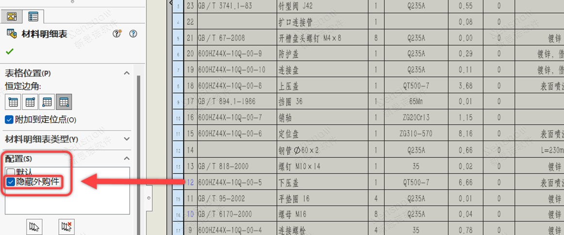 方法二:采用装配体多配置;专门为出图建配置(如一个“显示所有”,一个“隐藏外购件”),然后在 BOM 中选配置。繁琐、占内存、管理复杂,对性能有影响!